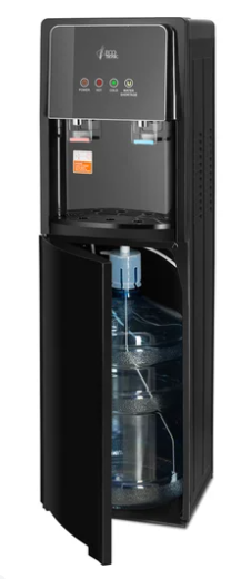 Напольный кулер с нижней загрузкой бутыли и электронным охлаждением. Краны «нажим кружкой». Корпус черного цвета с черной стеклянной вставкой на передней панели с индикаторами. Верхняя крышка с защитой от царапин. Индикация режимов нагрева и охлаждения воды, работы аппарата, индикатор пустой бутыли.